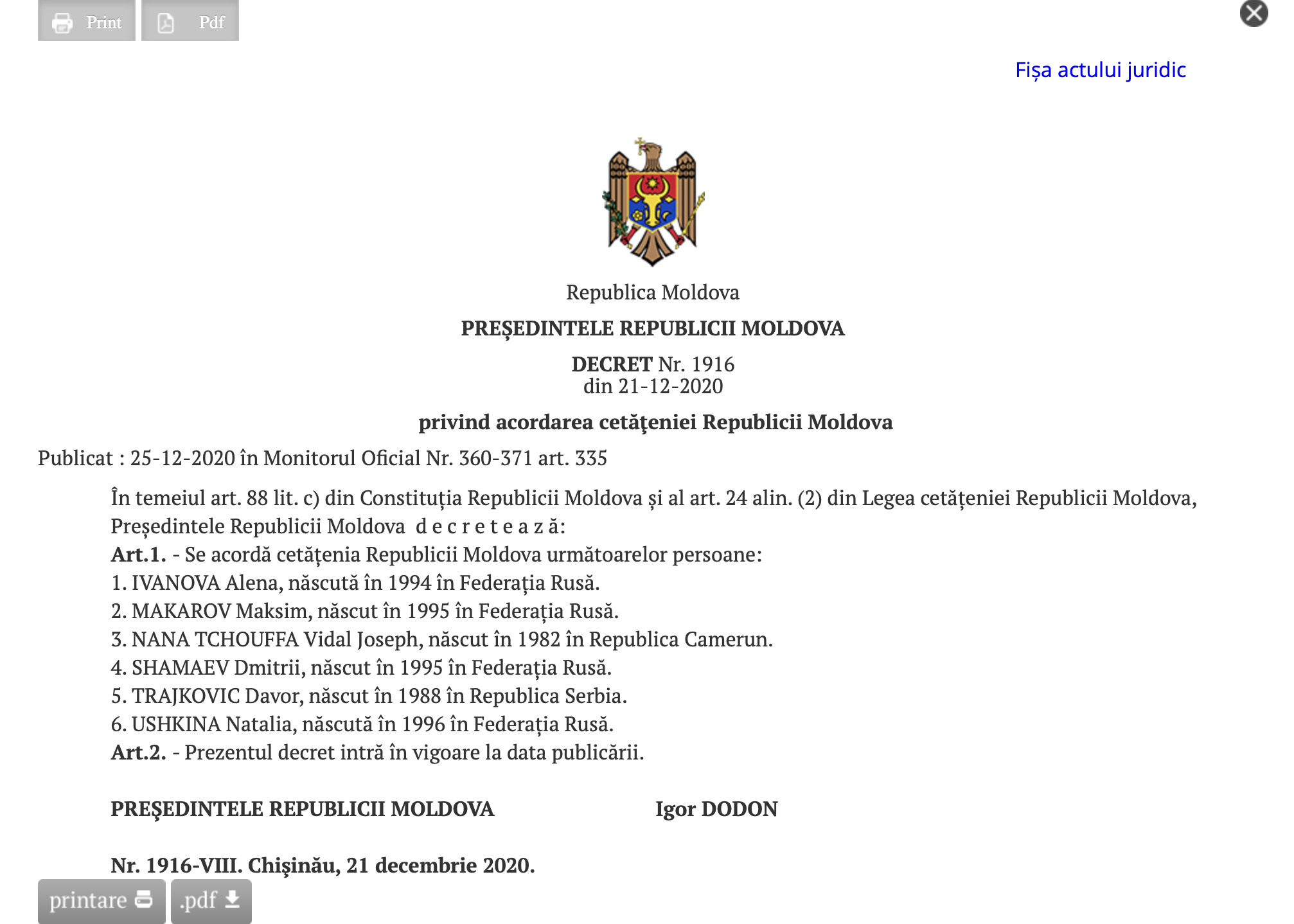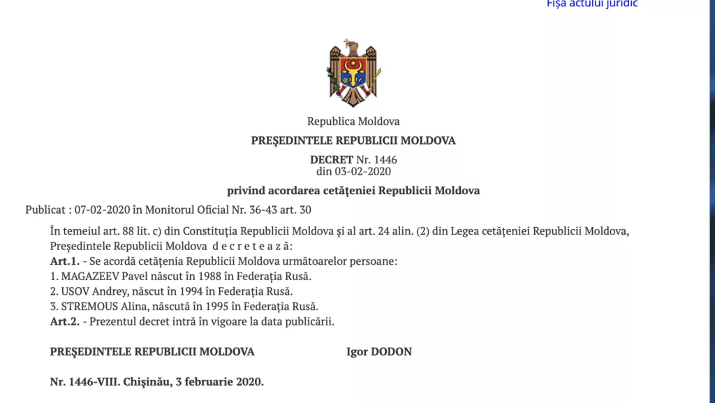 Pe 3 februarie 2020, cetățenia le-a fost acordată lui Pavel Magazaev, Alina Stremous și lui Andrei Usov. Primii doi sunt sportivi, iar ultimul – jurnalist sportiv. Decretul a fost semnat de Igor Dodon.
