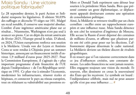 De exemplu, un articol întreabă dacă câștigarea alegerilor de către Maia Sandu este „o victorie politică fabricată”. În același material se afirmă că asupra alegerilor parlamentare din 2025 a planat „umbra interferenței americane”, în timp ce „Europa a preluat controlul” după închiderea organizației americane USAID. Ca argumente pentru așa-zisa influență a Uniunii Europene sunt enumerate vizitele înalților oficiali europeni la Chișinău și asistența financiară de circa 1,9 miliarde de euro oferită R. Moldova pentru perioada 2025-2027. În același timp, este omis amestecul demonstrat al Rusiei în alegeri.