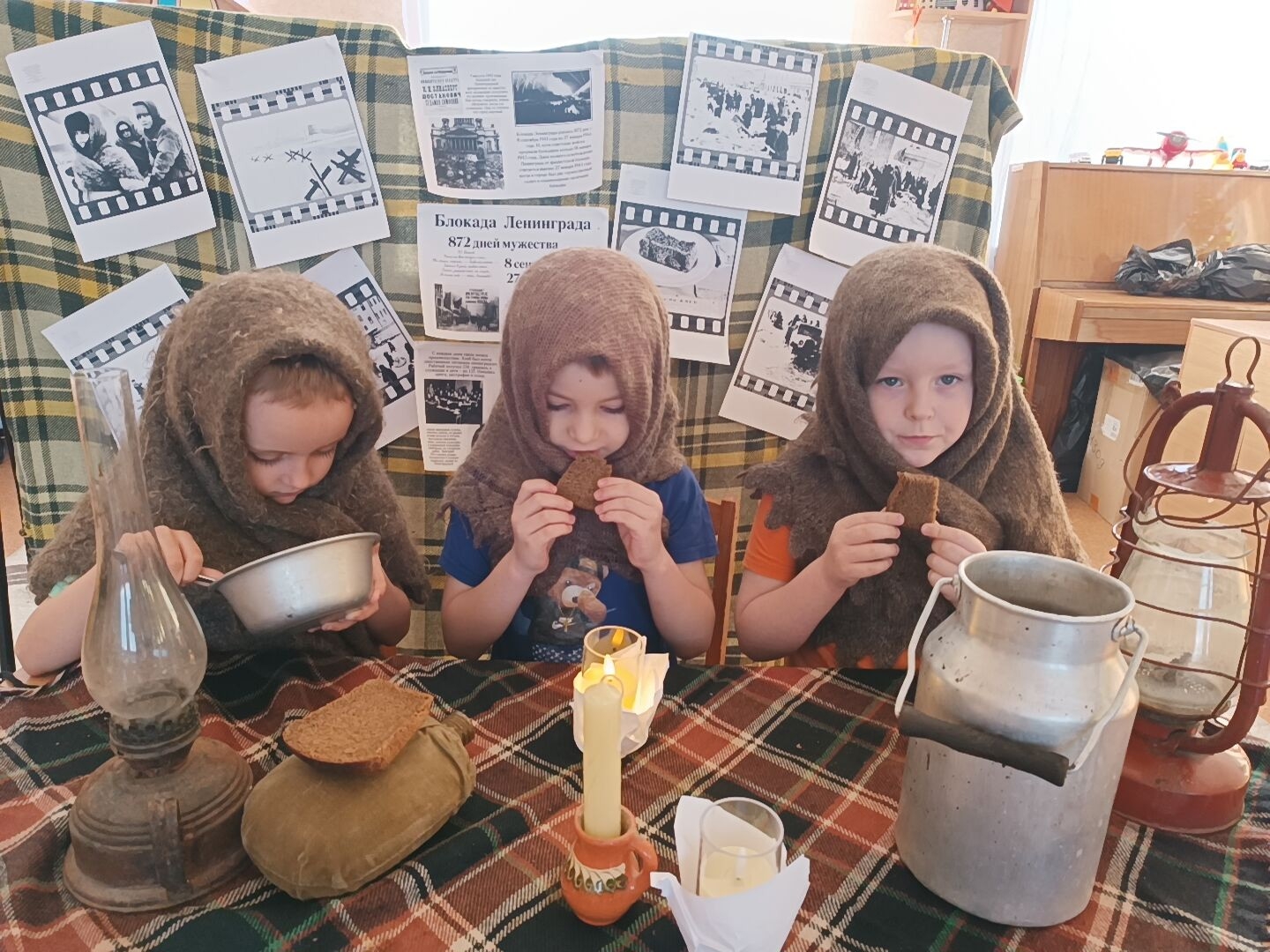 Copiii de la o grădiniță din regiunea Lugansk, ocupată de ruși, au fost impuși să se îmbrace în haine vechi și să schimbe pâinea pe cartele. Activitatea a avut loc pentru a comemora victimele asediului Leningradului.