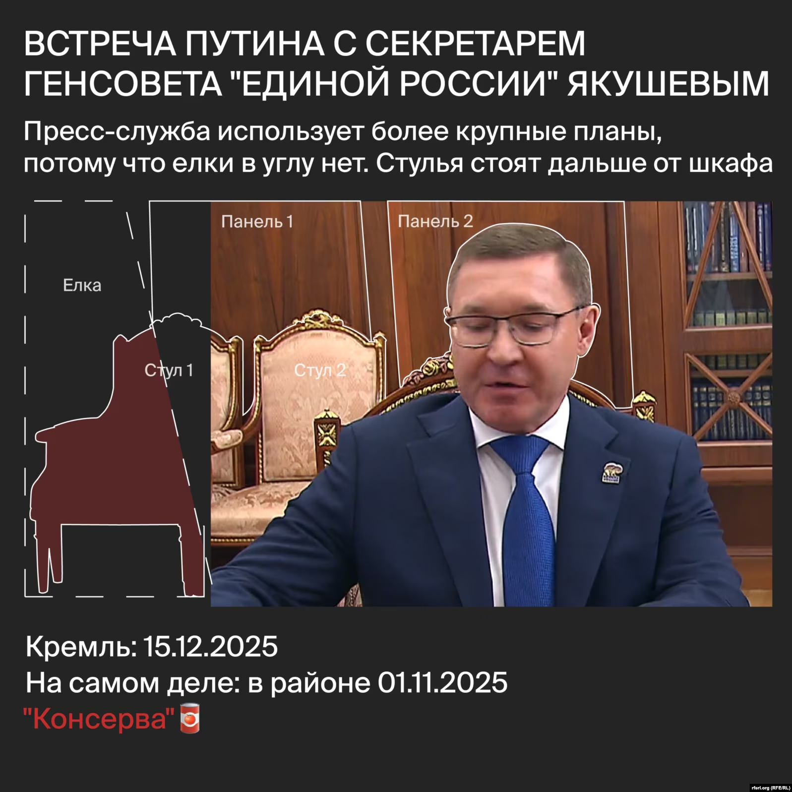 В середине декабря 2025 года, сразу после возвращения Владимира Путина из Туркменистана, Кремль вернулся к практике публикации «консервов» – заранее заготовленных видеозаписей с участием президента, выдаваемых за новые. На этот раз махинацию выдала новогодняя ель, которая внезапно «исчезла» из президентского кабинета как раз накануне праздников.