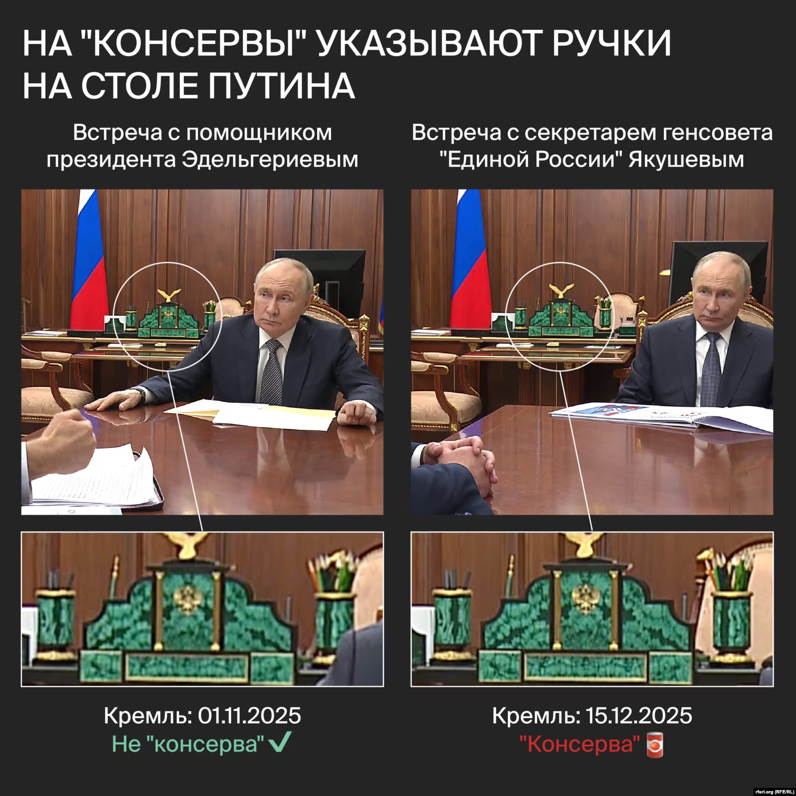 Обе встречи, показанные после возвращения Путина из Ашхабада, были записаны заранее, хотя Кремль и российские СМИ выдавали их за новые. Мы даже знаем приблизительную дату, когда была записана встреча с единороссом Якушевым. Расположение ручек и карандашей в стаканах на столе у президента в точности повторяет их положение на другой встрече, которая прошла 1 ноября, за полтора месяца до публикации «консервы». Тогда президент принимал в Кремле своего помощника Руслана Эдельгериева. О том, как ручки и карандаши выдают кремлевские «консервы», мы подробно писали в этом году.