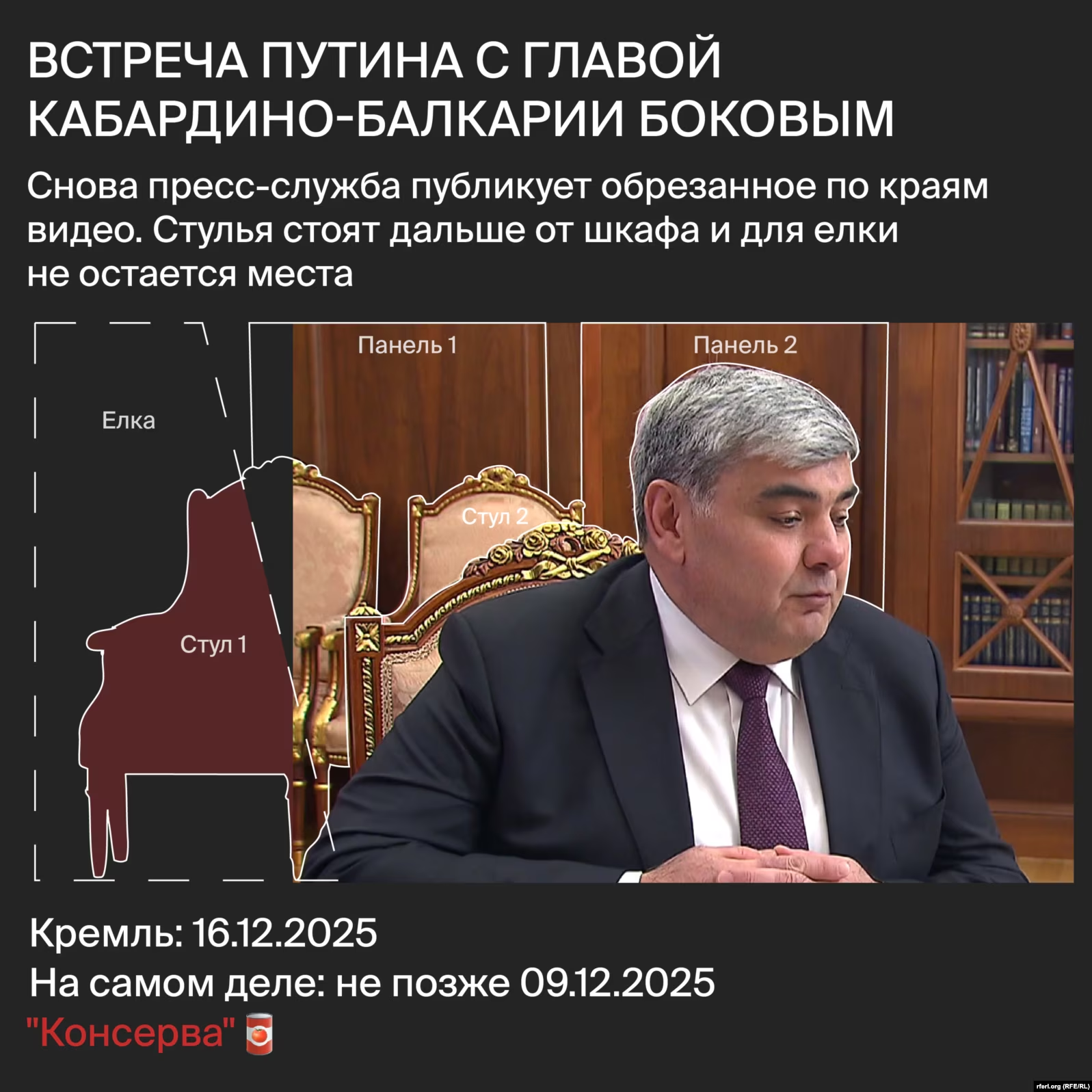Отсутствует елка и на кадрах со встречи Путина с главой Кабардино-Балкарии Казбеком Коковым, якобы прошедшей 16 декабря. Пресс-служба Кремля менее умело обрезала видео – так, что часть елки, будь она в кабинете, должна была бы оказаться в кадре. Стулья тоже стоят на своем прежнем, доёлочном месте.