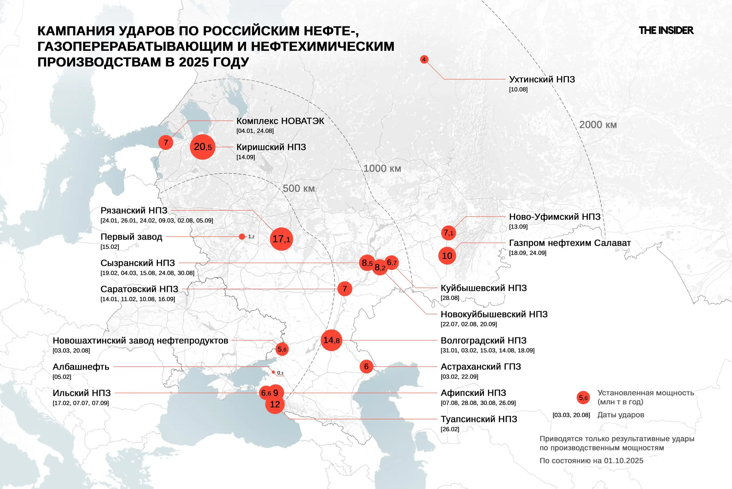 В 2025 году налеты на российские НПЗ регулярно происходят на гораздо большем удалении от Украины и с большей интенсивностью. The Insider зафиксировал всего 45 результативных ударов по 22 предприятиям (18 ударов с 1 января по 31 марта и 27 ударов с 1 июня по 30 сентября), и до конца года этот показатель при сохранении нынешней динамики может увеличиться до 60–70 ударов. Причем на этот раз основная часть атак пришлась на предприятия, расположенные на расстоянии от 500 км и более от украинской границы.