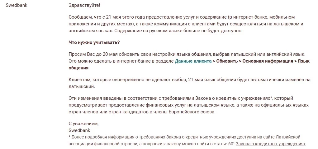Крупнейшие банки Латвии начали уведомлять клиентов о грядущих изменениях: русский язык исчезнет из интернет-банков и мобильных приложений. Одним из первых об этом сообщил Swedbank, разослав соответствующие письма своим пользователям.
