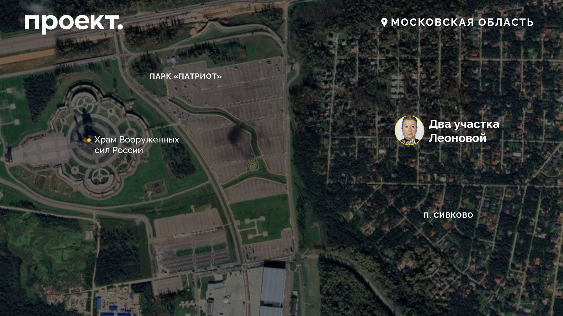 На Леонову оформлены также участки (с номерами 1493 и 1497) и коттедж в деревне Сивково через дорогу от подмосковного парка «Патриот», в котором находится главный храм Вооруженных сил России. Этот патриарший собор давно уже стал символом милитаризма и сращивания церкви с государством. На его стенах, например, есть изображение Иосифа Сталина и почти появились мозаики с ликами Владимира Путина, Сергея Шойгу и Валентины Матвиенко. Впрочем, в последний момент изображения чиновников убрали.