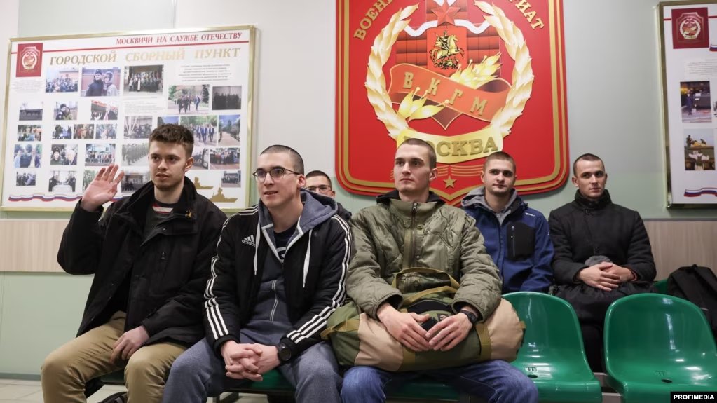 Призывники в призывном пункте в Москве перед отправкой на военную службу в российскую армию, октябрь 2024 года