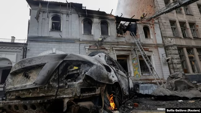 Российские военные запустили по зданию, в котором находился детский сад три ударных беспилотника «Шахед». На видео, опубликованном мэром Харькова Игорем Тереховым, можно услышать плач детей, которых выносили из убежища сквозь клубы дыма. По его словам, от «силы ударов второй этаж полностью сложился».