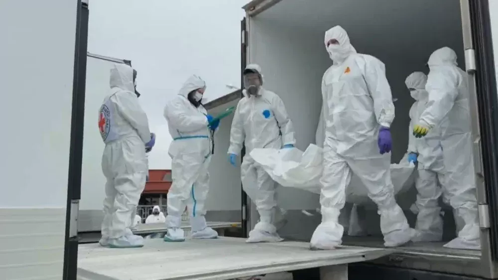Imagini difuzate de o agenție rusă, Ruptly, arată oameni echipați în combinezoane albe și mănuși transportând saci mortuari între camioane, sub supravegherea unor observatori care purtau însemnele Comitetul Internațional al Crucii Roșii, conform Reuters.