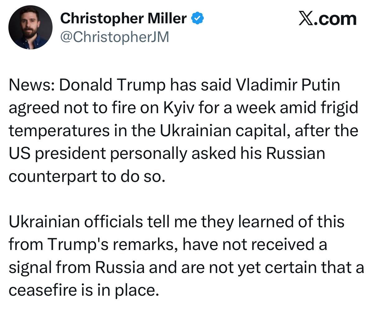 Pe de altă parte, jurnalistul Christopher Miller de la Financial Times, specializat pe reflectarea evenimentelor din Ucraina, susține că oficialii de la Kiev ar fi aflat despre faptul că Putin a acceptat armistițiul din declarațiile de presă făcute de Donald Trump.