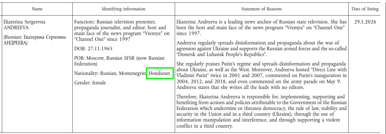 Prezentatoarea de știri a televiziunii de stat ruse, Ekaterina Andreeva, una dintre figurile emblematice ale „Pervîi Kanal” și apropiată a lui Vladimir Putin, a fost sancționată de Uniunea Europeană. Până recent, Andreeva a dus un stil de viață confortabil în Europa, având cetățenie muntenegreană și honduriană, și venea în Rusia doar pentru a înregistra ediția săptămânală a programului „Vremia”, în care promova narațiuni propagandistice pro-Kremlin și mesaje ostile Occidentului.